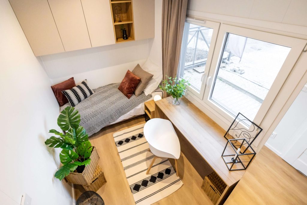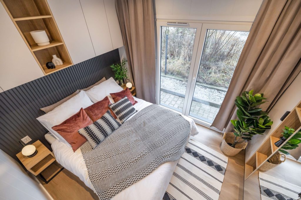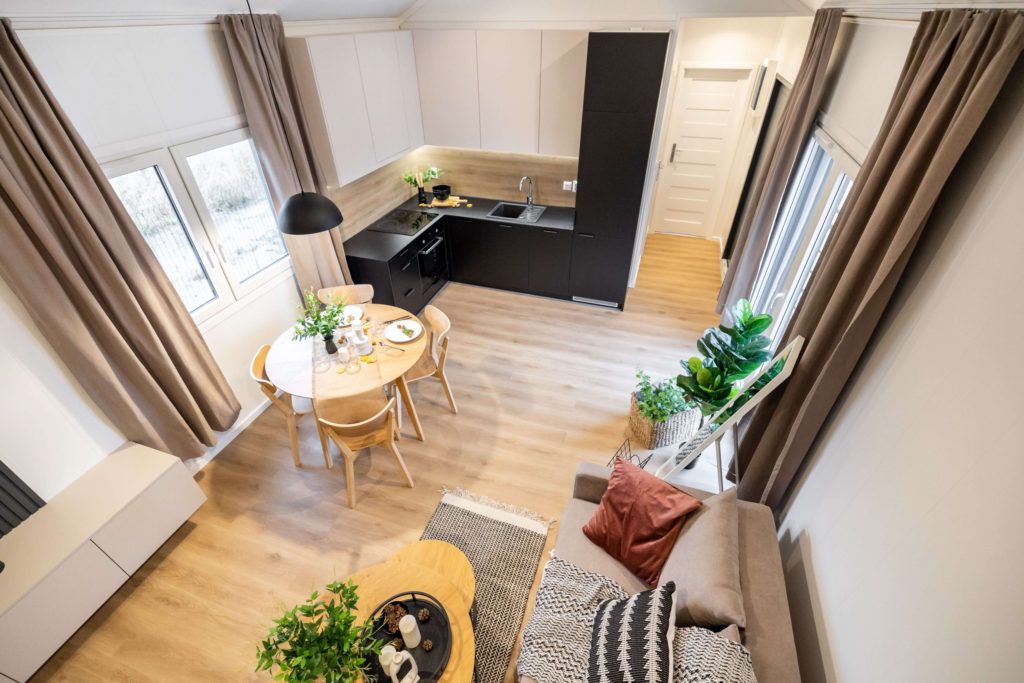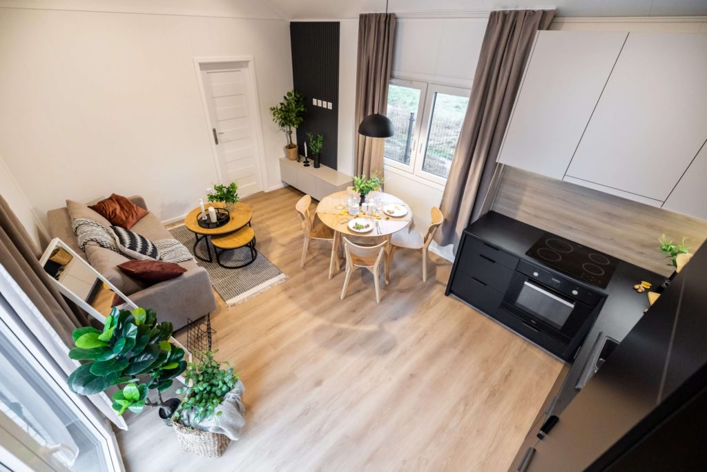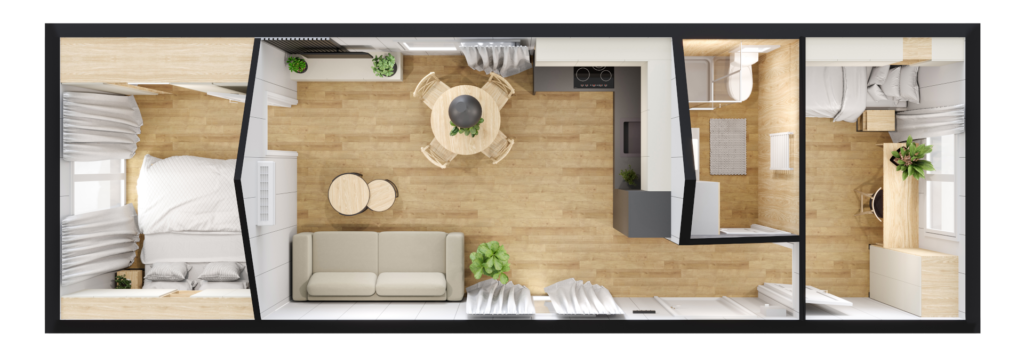 Model domku mobilnego bez kół. Dzięki zastosowaniu mobilnego podwozia bez kół uzyskaliśmy kąt nachylenia dachu 30°. Dzięki temu nasz domek mobilny jest bardziej przestrzenny i doskonale sprawdzi się do zamieszkania przez cały rok.