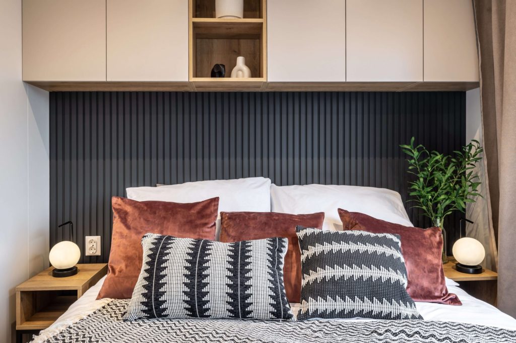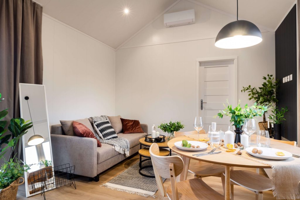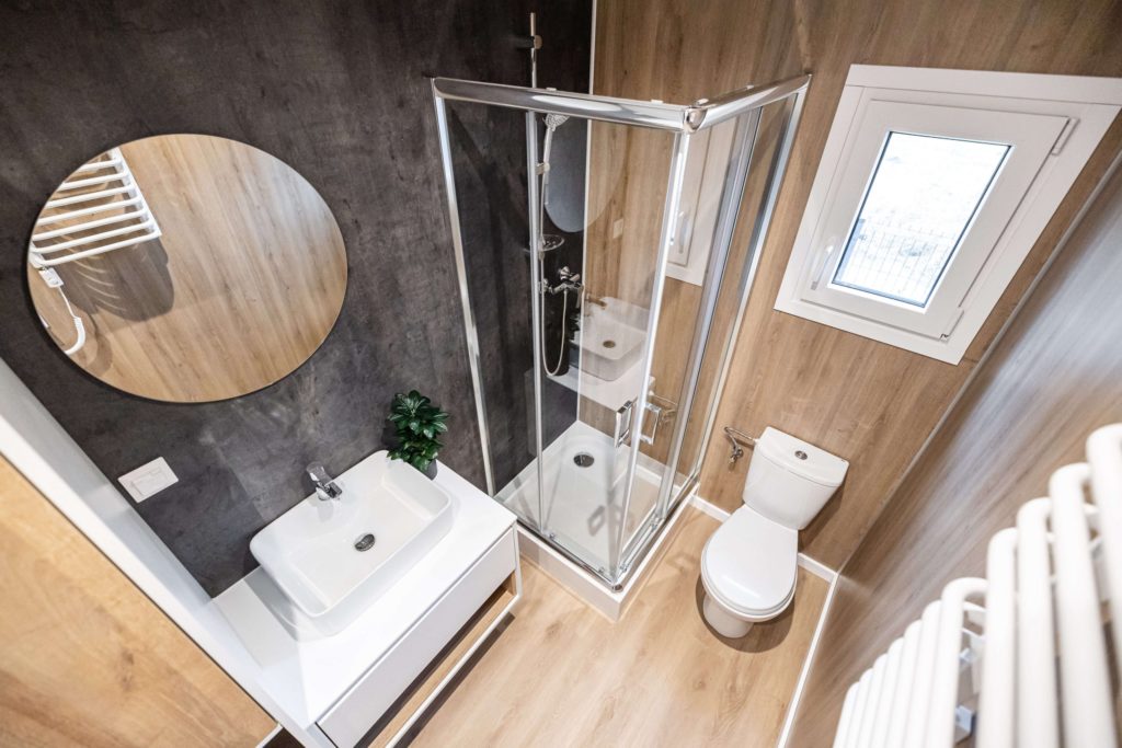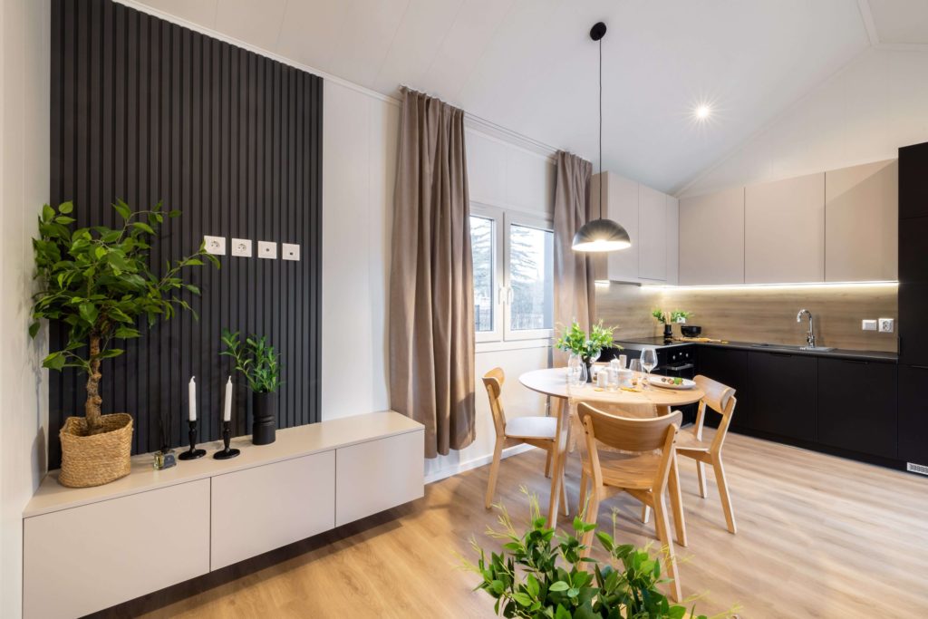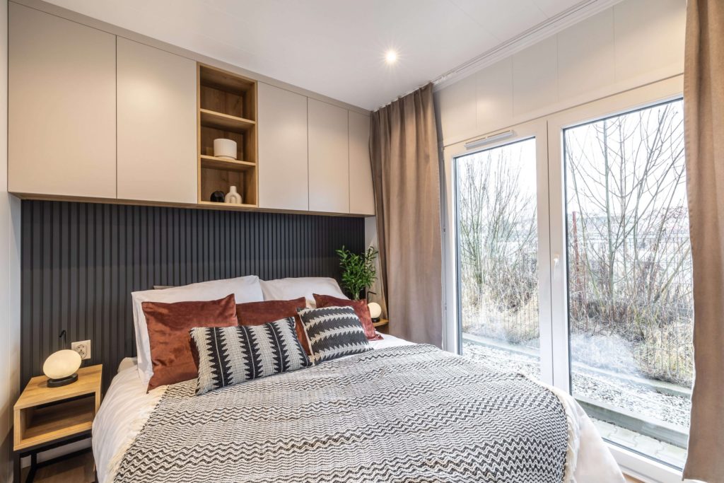 Model domku mobilnego bez kół. Dzięki zastosowaniu mobilnego podwozia bez kół uzyskaliśmy kąt nachylenia dachu 30°. Dzięki temu nasz domek mobilny jest bardziej przestrzenny i doskonale sprawdzi się do zamieszkania przez cały rok.
